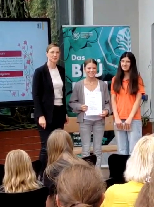Am 17. September 2025 fand im Botanischen Garten der Universität Leipzig die feierliche Auszeichnungsveranstaltung statt. Jugendbürgermeisterin Vicki Felthaus überreichte dort die Preise an die elf besten Projekte aus Leipziger Schulen und Bildungseinrichtungen. Unter den Preisträgerinnen befanden sich auch unsere drei Schülerinnen, die für ihren innovativen Beitrag Account@nachhaltig.co geehrt wurden (https://www.leipzig.de/newsarchiv/news/preise-im-kinder-und-jugendumweltwettbewerb-vergeben-1).